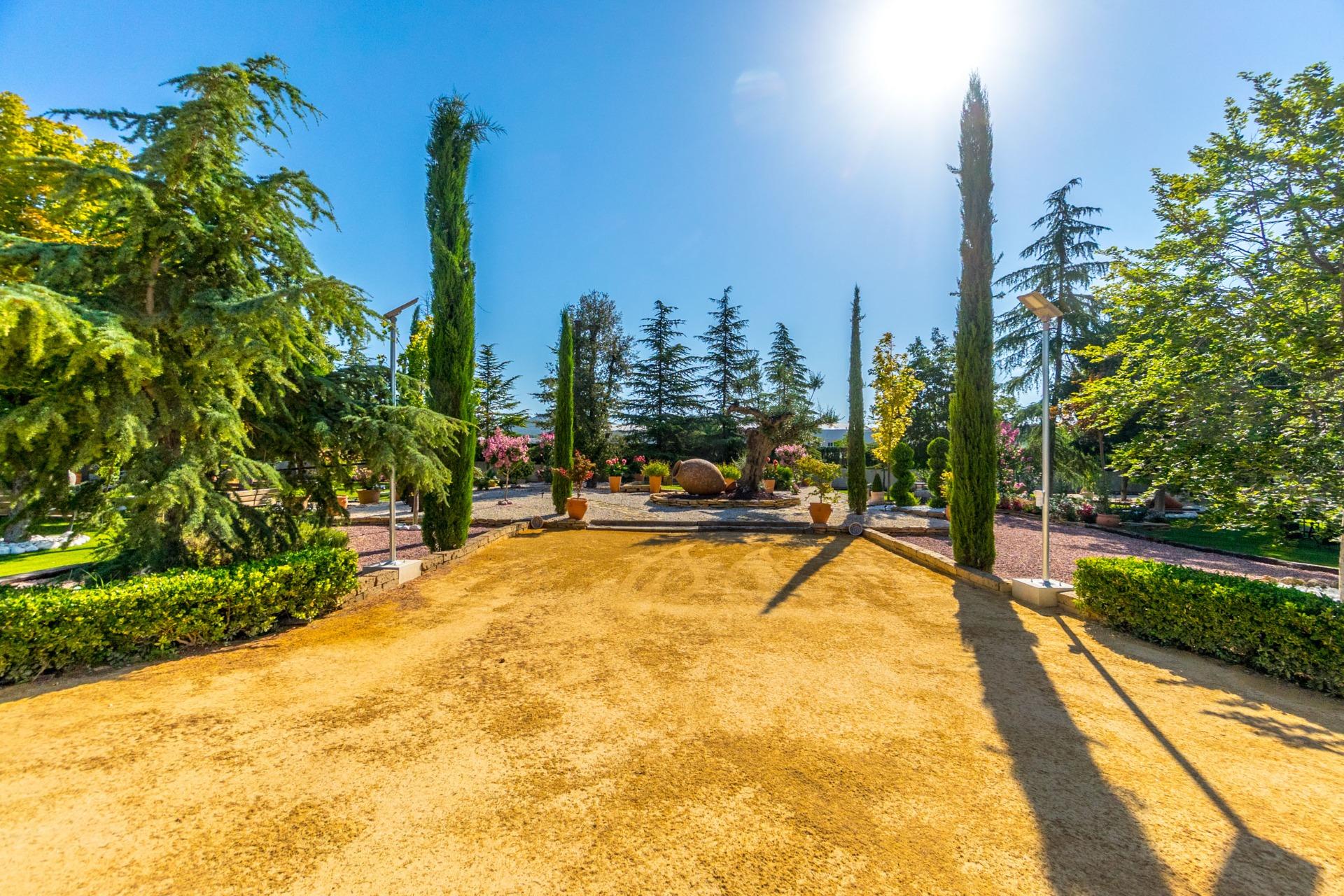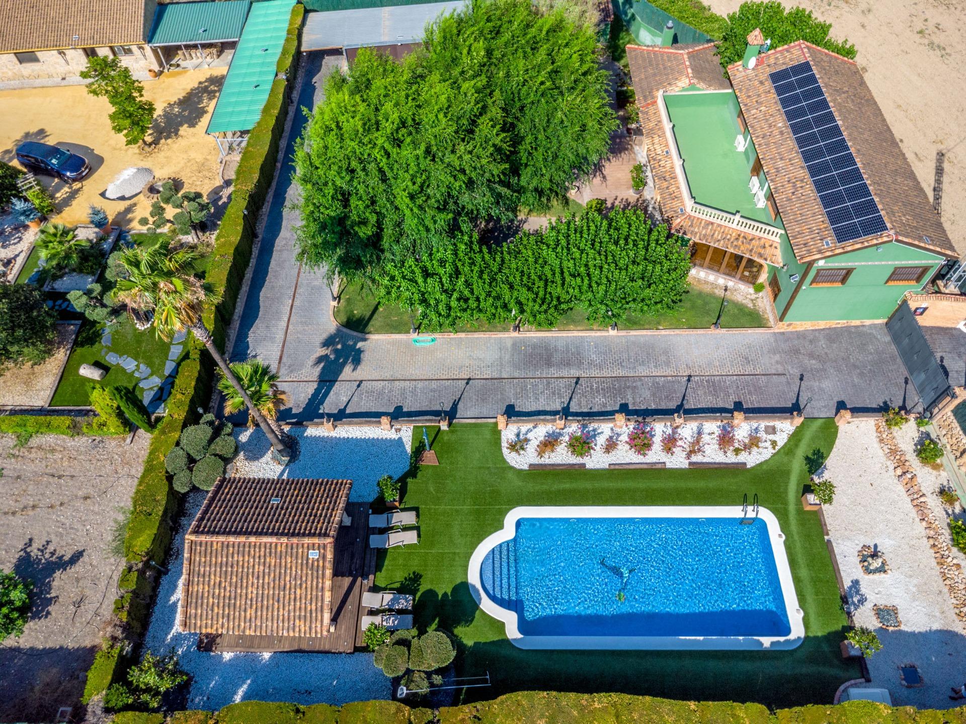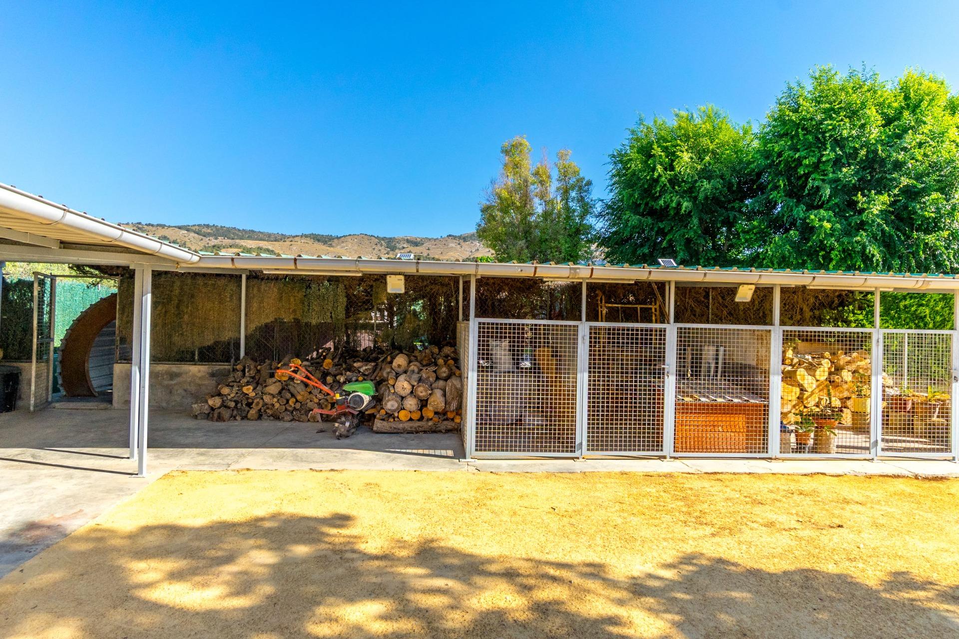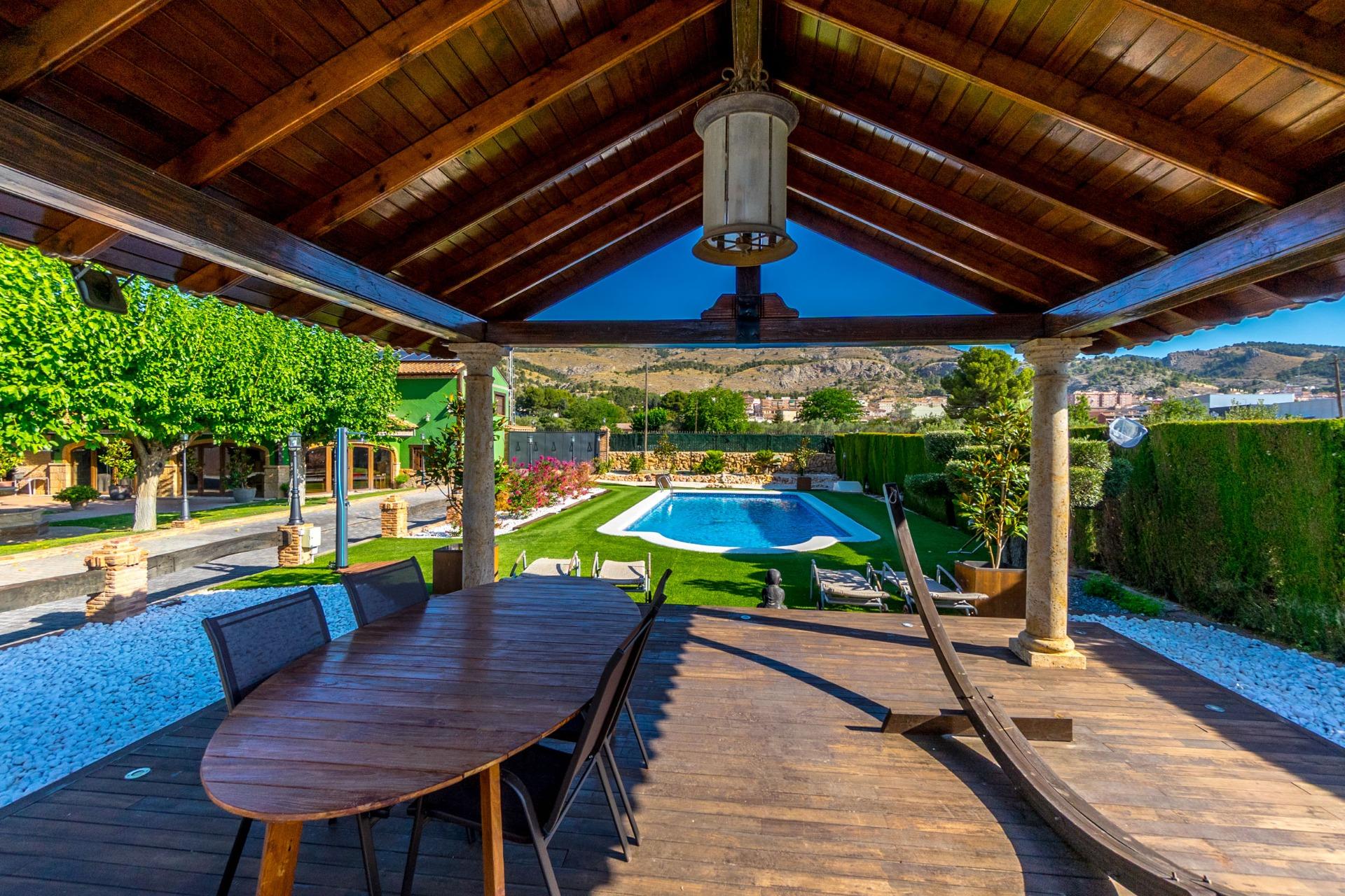 Chalet exclusivo en Onil, situado en una parcela de 5.968 m² dividida en dos zonas bien diferenciadas y completamente vallada con cámaras de seguridad, ideal para quienes buscan privacidad, confort y posibilidades de ocio.~~ZONA RESIDENCIAL (1.700 M²)~Aquí se ubica la vivienda principal que cuenta con una gran piscina privada con un porche de obra elegante y aparcamiento exterior para hasta 4 vehículos. También incluye dos pozos de agua para riego, combinando comodidad y eficiencia. La vivienda se distribuye en:~•PLANTA BAJA: Dos salones (uno interior amplio y luminoso, y otro exterior con grandes cristaleras mirando al jardín, el salón cuenta con una gran barbacoa. Entrando al salón interior tenemos una cocina con galería y un baño completo.~•PLANTA SUPERIOR: Cuatro dormitorios, dos baños y una gran terraza con vistas despejadas al entorno.~JARDÍN ORIENTAL (4.268 M²)~~Un espacio con personalidad propia, con pérgolas de madera, senderos para pasear, rincones decorados con estatuas, plantas orientales y elementos decorativos. Incluye un almacén que puede habilitarse como casa de invitados o zona de recreo. Este jardín es ideal para organizar eventos, disfrutar de la tranquilidad o desarrollar proyectos al aire libre.~~CONFORT Y EFICIENCIA~El chalet está listo para vivir todo el año, equipado con calefacción por gasoil y placas solares, combinando confort y sostenibilidad.~~UBICACIÓN~A menos de 700 metros del centro de Onil, un pueblo con encanto en la comarca de l’Alcoià, conocido por su tradición en la fabricación de juguetes, sus festivales locales y su entorno natural cercano a la sierra. Onil ofrece un clima mediterráneo con inviernos suaves y muy raramente nieva, lo que permite disfrutar de la vivienda durante todo el año.~Una propiedad única para quienes buscan un hogar con carácter, privacidad y amplias posibilidades de disfrute.~