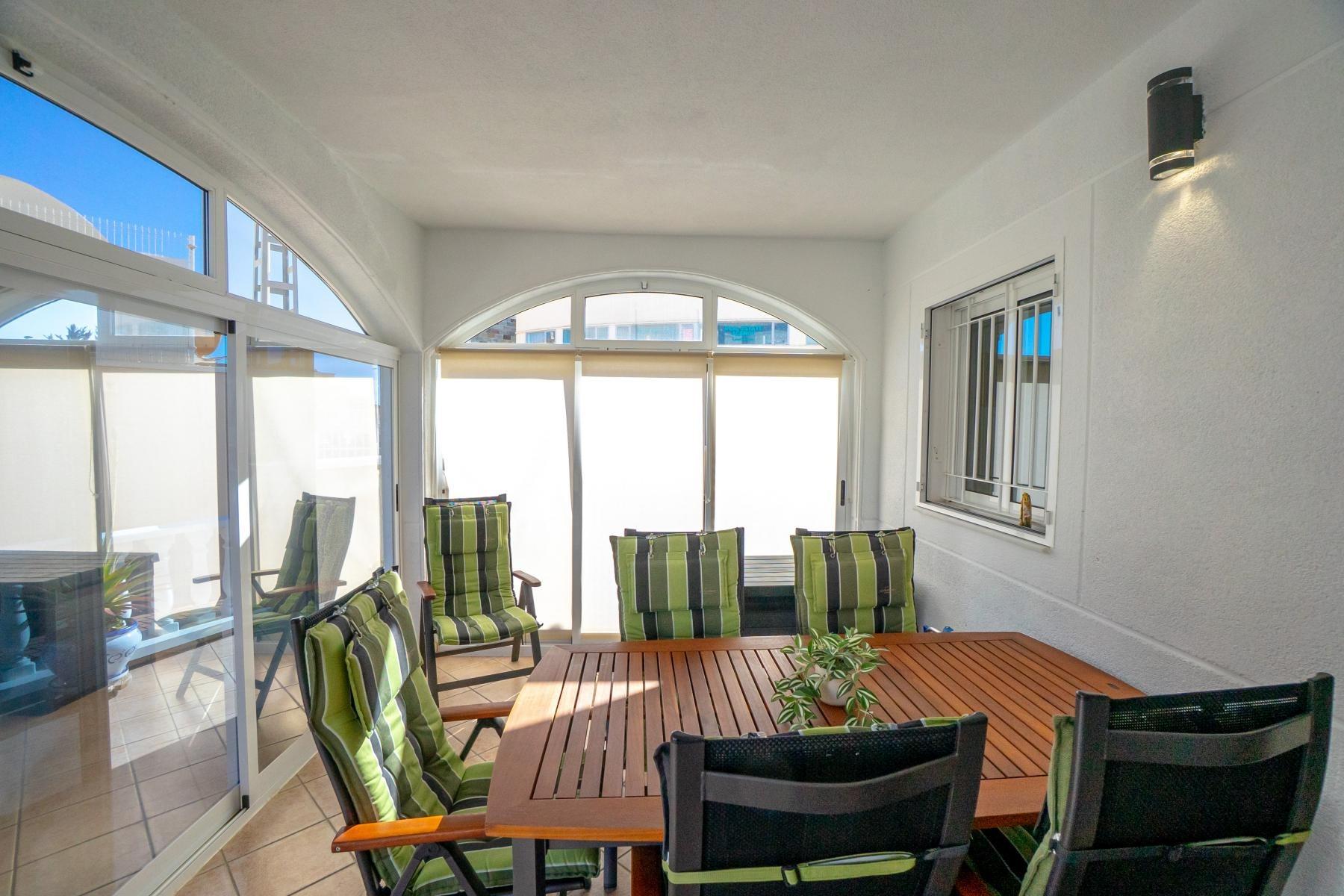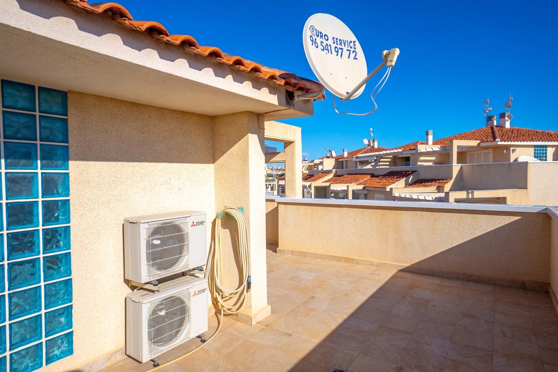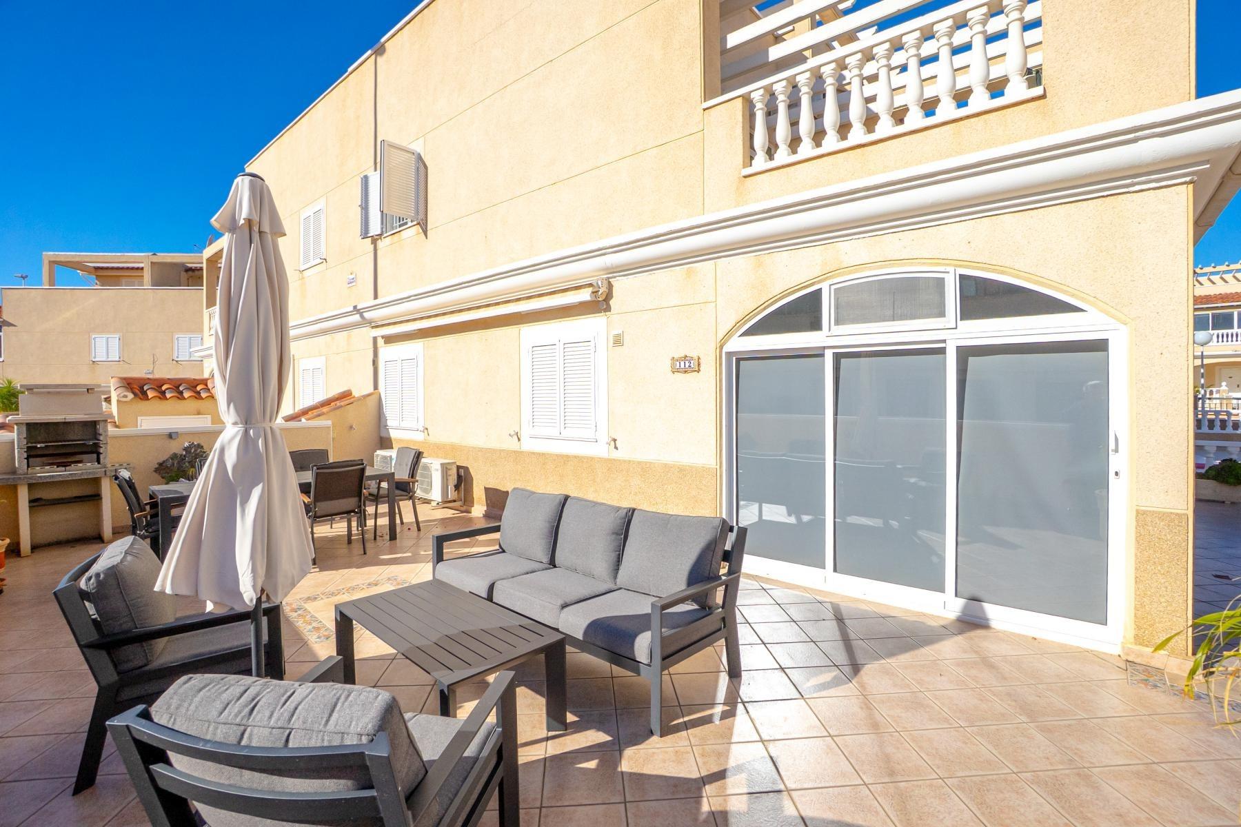 Adosado tipo Quad en esquina, de dos plantas más solárium, con escalera interior y ubicado a pocos pasos de la piscina comunitaria, en la consolidada y demandada urbanización Zeniamar V, Orihuela Costa. Una propiedad que destaca por su luminosidad, comodidad y entorno tranquilo, ideal tanto como residencia habitual como vivienda vacacional.~~La urbanización ofrece amplias zonas ajardinadas, gran piscina comunitaria y un ambiente cuidado, con una excelente ubicación próxima a supermercados, cafeterías, restaurantes, el reconocido Centro Comercial Zenia Boulevard, el mercadillo de Playa Flamenca y las playas de Orihuela Costa.~~En la planta baja, la vivienda dispone de una amplia terraza acristalada que conecta directamente con el salón, cocina americana totalmente equipada con electrodomésticos y galería, un dormitorio, un baño completo reformado con suelo radiante, y un práctico trastero.~~La primera planta cuenta con dos dormitorios adicionales, un segundo baño y una terraza con zona acristalada y zona descubierta, con vistas despejadas, ideal para el descanso o el ocio.~~En la planta solárium encontramos una salita polivalente, adaptable a distintos usos (almacenamiento, despacho, zona relax) y una amplia terraza descubierta, perfecta para disfrutar del excelente clima de la zona durante todo el año.~~La propiedad se completa con un jardín embaldosado en esquina de aproximadamente 69 m², con espacio suficiente para comedor exterior, barbacoa o zona chill-out, ideal para reuniones familiares o con amigos.~~La vivienda se encuentra en perfecto estado de conservación, dispone de aire acondicionado por splits inverter en todas las estancias, se vende totalmente amueblada y equipada, e incluye plaza de garaje y trastero en el garaje subterráneo del residencial.~
