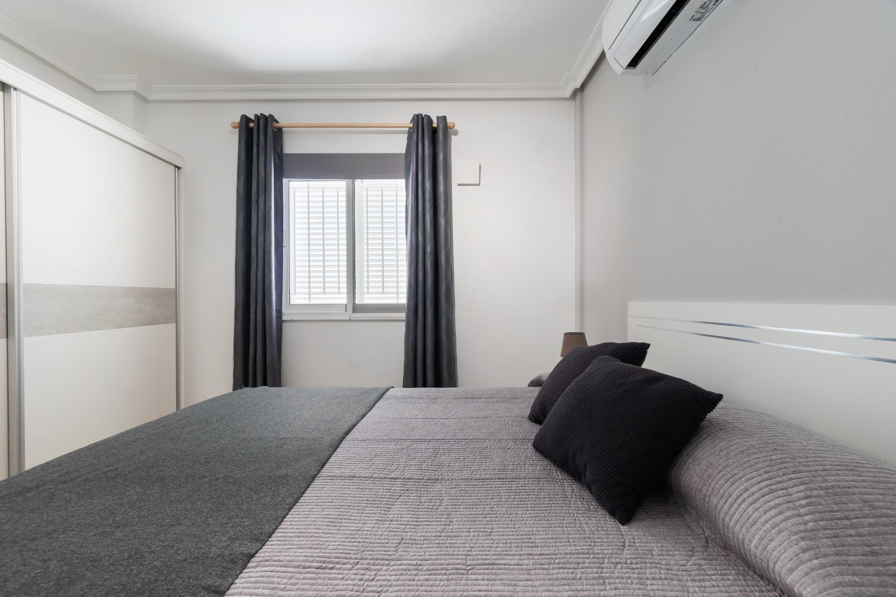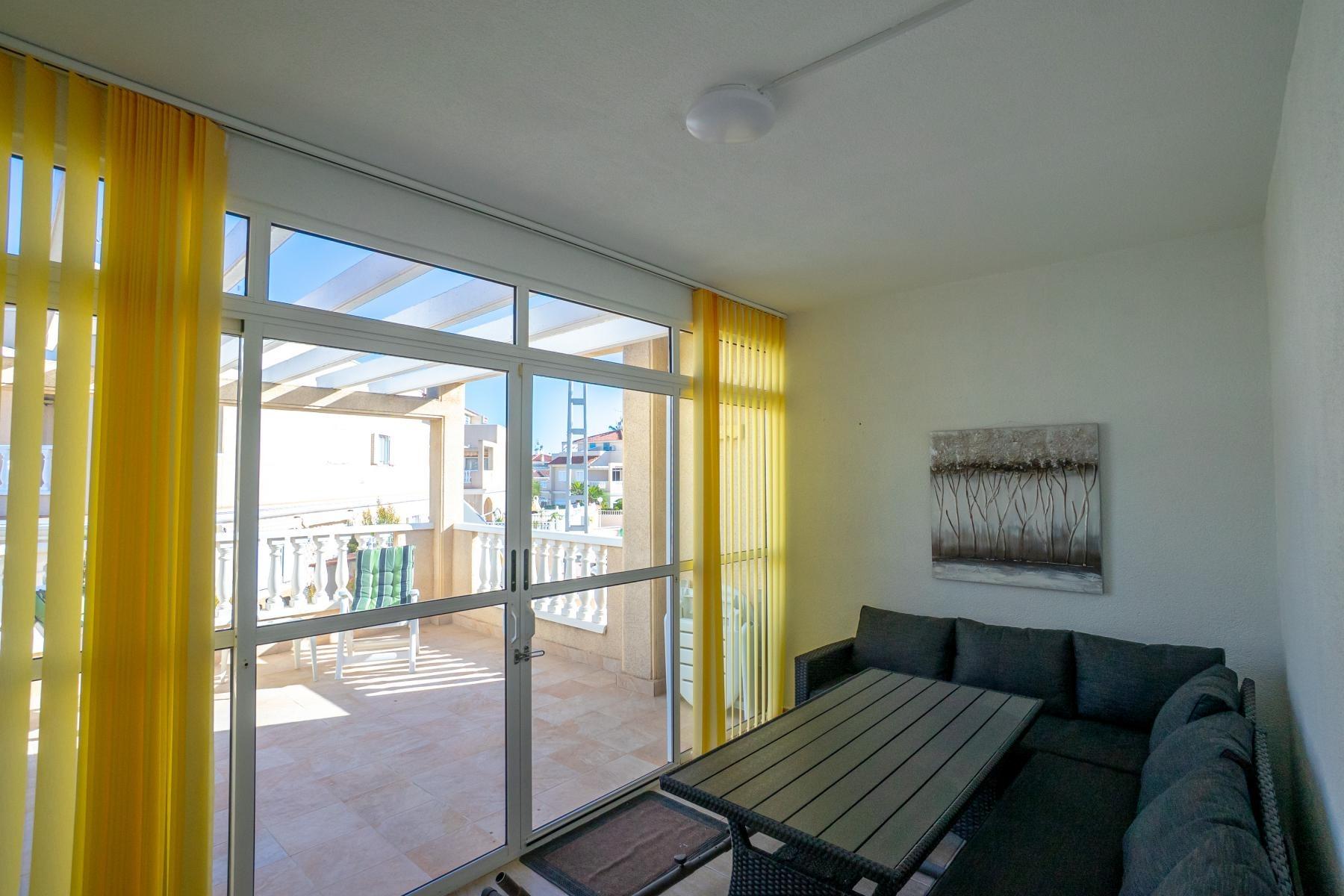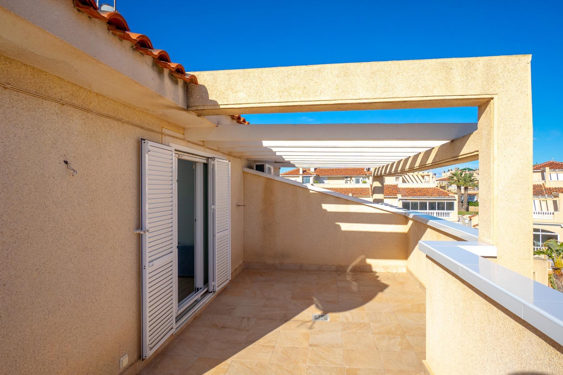 Adosado tipo Quad en esquina, de dos plantas más solárium, con escalera interior y ubicado a pocos pasos de la piscina comunitaria, en la consolidada y demandada urbanización Zeniamar V, Orihuela Costa. Una propiedad que destaca por su luminosidad, comodidad y entorno tranquilo, ideal tanto como residencia habitual como vivienda vacacional.~~La urbanización ofrece amplias zonas ajardinadas, gran piscina comunitaria y un ambiente cuidado, con una excelente ubicación próxima a supermercados, cafeterías, restaurantes, el reconocido Centro Comercial Zenia Boulevard, el mercadillo de Playa Flamenca y las playas de Orihuela Costa.~~En la planta baja, la vivienda dispone de una amplia terraza acristalada que conecta directamente con el salón, cocina americana totalmente equipada con electrodomésticos y galería, un dormitorio, un baño completo reformado con suelo radiante, y un práctico trastero.~~La primera planta cuenta con dos dormitorios adicionales, un segundo baño y una terraza con zona acristalada y zona descubierta, con vistas despejadas, ideal para el descanso o el ocio.~~En la planta solárium encontramos una salita polivalente, adaptable a distintos usos (almacenamiento, despacho, zona relax) y una amplia terraza descubierta, perfecta para disfrutar del excelente clima de la zona durante todo el año.~~La propiedad se completa con un jardín embaldosado en esquina de aproximadamente 69 m², con espacio suficiente para comedor exterior, barbacoa o zona chill-out, ideal para reuniones familiares o con amigos.~~La vivienda se encuentra en perfecto estado de conservación, dispone de aire acondicionado por splits inverter en todas las estancias, se vende totalmente amueblada y equipada, e incluye plaza de garaje y trastero en el garaje subterráneo del residencial.~