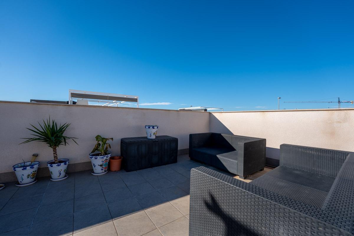 Descubre este precioso bungalow en planta alta, ubicado en esquina, que destacapor su excelente luminosidad y su ambiente acogedor.~El acceso a la vivienda conduce a una agradable terraza ideal para disfrutar del aire libre y de las vistas despejadas del entorno.~~En el interior, el salón-comedor resulta especialmente luminoso gracias a su orientación y a una ventana adicional, creando un espacio amplio y confortable que se integra perfectamente con la cocina, ideal para el día a día y para compartir momentos especiales.~La vivienda cuenta con ventilación cruzada, lo que garantiza una temperatura agradable durante todo el año y una conexión directa con el solárium privado, un espacio perfecto para relajarse, tomar el sol o crear una zona chill-out.~~Dispone de dos dormitorios bien distribuidos, uno de ellos con baño en suite, además de un segundo baño completo que aporta comodidad y funcionalidad.~En la planta superior, el amplio solárium privado se convierte en el gran protagonista, ofreciendo múltiples posibilidades para disfrutar del clima mediterráneo en total privacidad.~La propiedad forma parte de un residencial con piscina comunitaria, ideal para refrescarse y disfrutar en familia. Una vivienda luminosa, bien ubicada y con todas las comodidades necesarias para vivir o invertir en la Costa Blanca.~