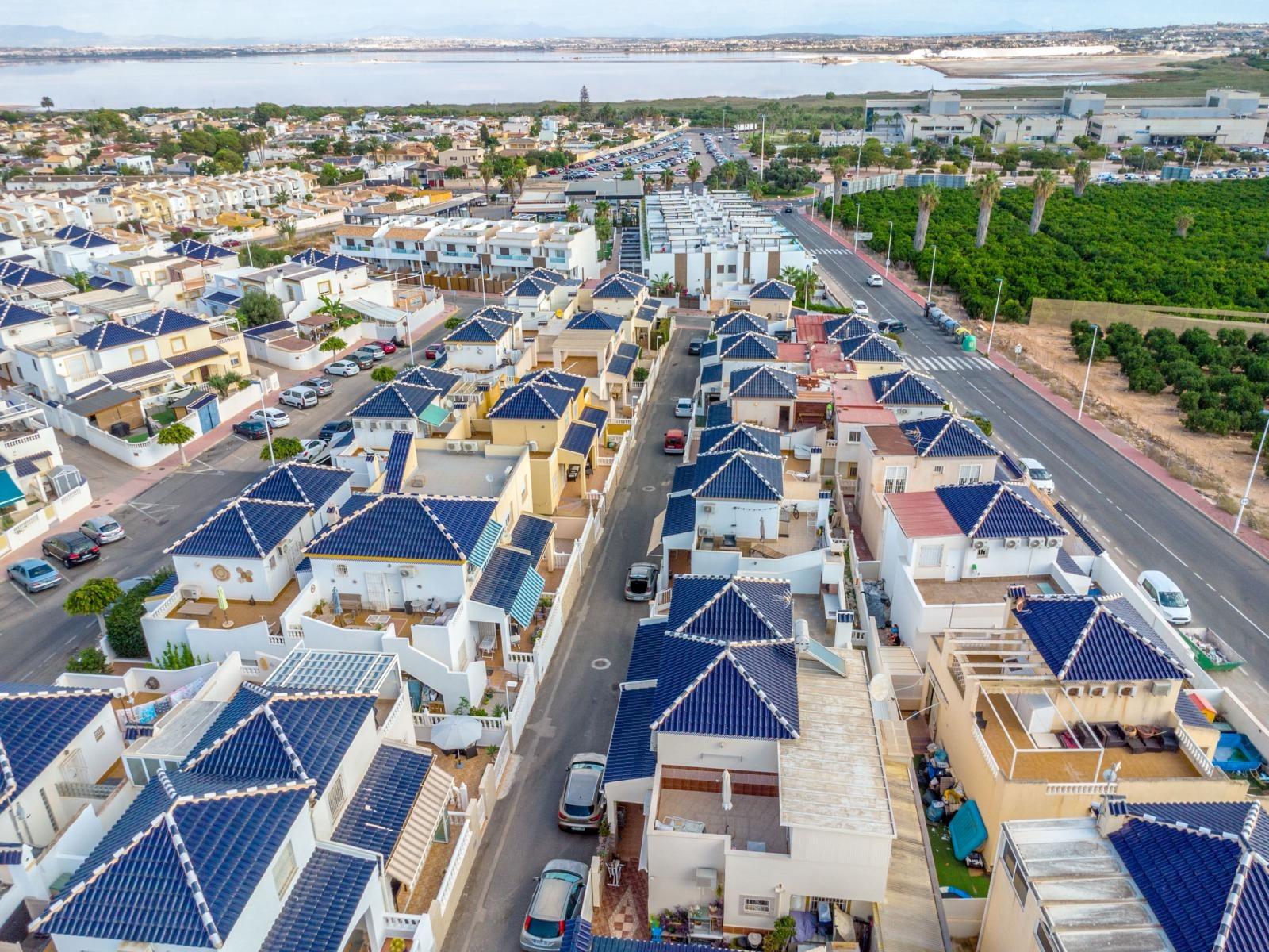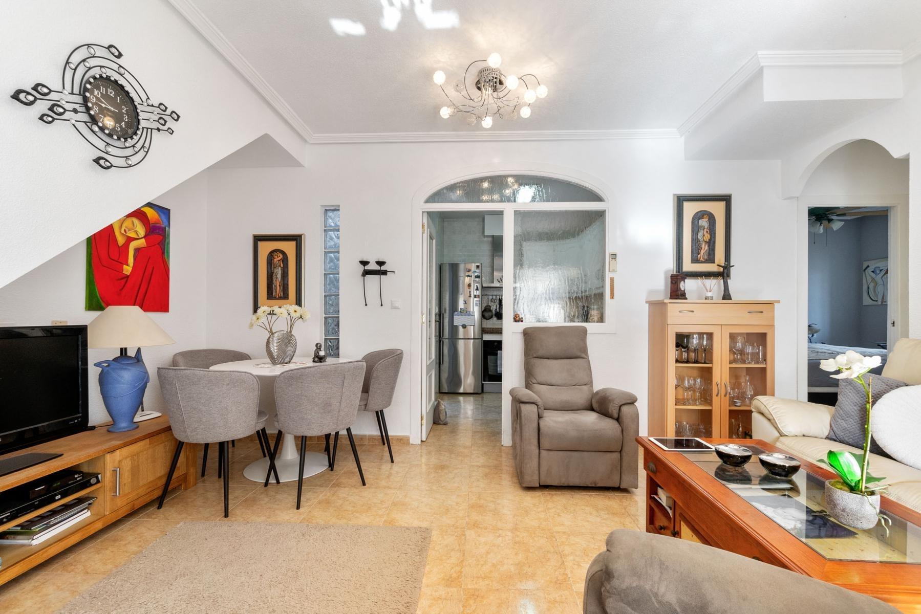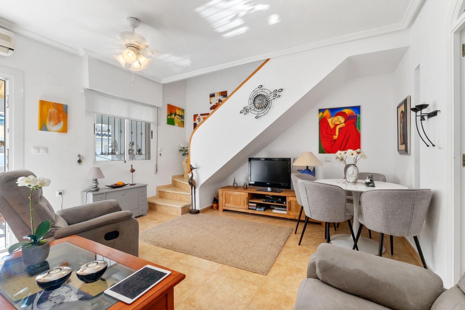 En venta: encantadora vivienda tipo Quad ubicada en una zona tranquila de Torrevieja, en el residencial Mirador de los Balcones II, rodeada de vecinos que residen todo el año, con un ambiente agradable y cercano.~~La ubicación es ideal, con todos los servicios a mano: supermercados, farmacia, hospital y playas de Torrevieja a pocos minutos.~~El residencial ofrece bonitas zonas comunes con piscina comunitaria exclusiva para residentes, perfecta para disfrutar del clima mediterráneo.~~Distribución:~~Planta principal: jardín privado con entrada para coche, porche cubierto tipo terraza, salón-comedor luminoso, cocina independiente totalmente equipada, 2 dormitorios y 1 baño completo.~~Planta superior: dormitorio adicional con baño propio, además de una amplia terraza solárium (parte cubierta y parte abierta), ideal para disfrutar del sol con total privacidad y agradables vistas despejadas.~~La vivienda cuenta con muy buena orientación, lo que garantiza luz natural durante todo el año. Se vende completamente amueblada y equipada, lista para entrar a vivir sin necesidad de inversión adicional.~~Ya sea como residencia habitual o como casa de vacaciones, esta propiedad es una gran oportunidad.~No pierda la ocasión de visitarla. Contáctenos hoy mismo. ¡Le encantará!~